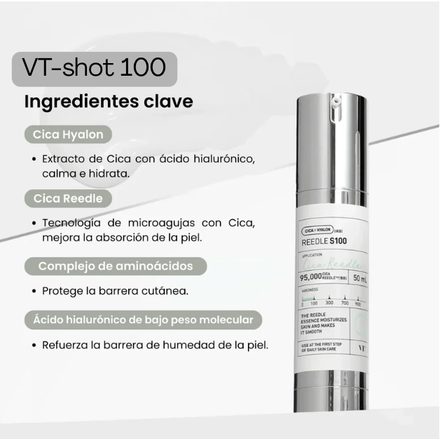 El VT Cosmetics – Shot 100 es un concentrado en gotas que potencia tu rutina con un activo puro y altamente eficaz. Su textura ligera se absorbe rápido y aporta un beneficio directo: más hidratación, calma, firmeza o luminosidad según la versión del shot que utilices.
